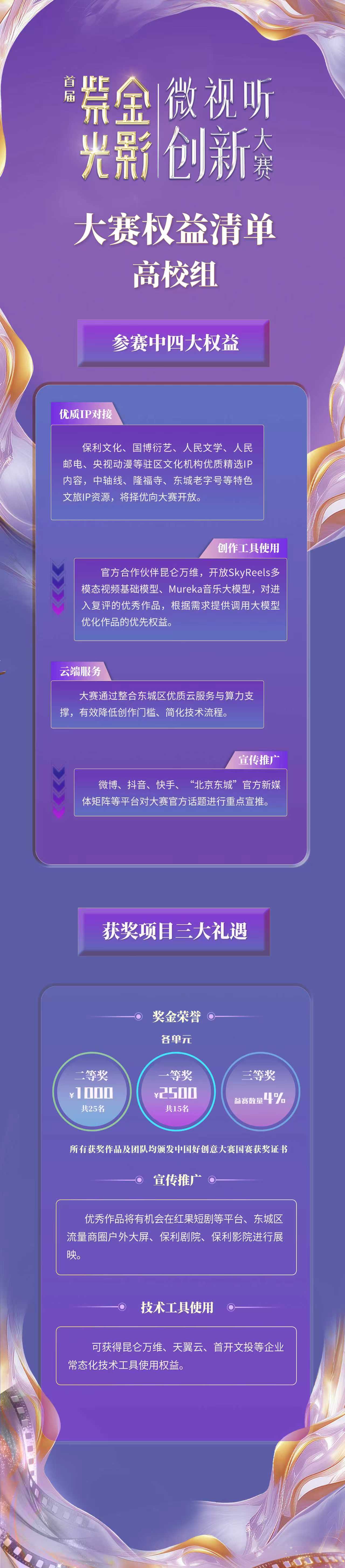 北京市东城区作为文化底蕴深厚、资源富集的全国文化中心核心承载区,以举办本次大赛为契机,明确“以赛引才、以赛促产、以赛聚链、以赛兴业”目标,吸引国内外顶尖制作机构、技术公司、创作人才、投资机构落户东城或建立深度合作,着力打造具有全球影响力的微视听产业高地,做强“东城微视听”产业生态,塑造微视听领域技术革新、前沿展示与文化交流的标志性活动。在方寸银幕之间,见微知著;于紫金光影之下,洞见未来。